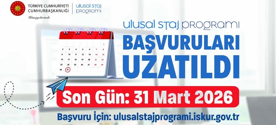 Cumhurbaşkanlığı Himayelerinde Türkiye İş Kurumu (İŞKUR) koordinasyonunda 2026 yılı “Ulusal Staj Programı” öğrenci başvuruları 06 Ocak 2026 tarihinde başlamış olup 31 Mart 2026 tarihi saat 23:59’a kadar devam edecektir.